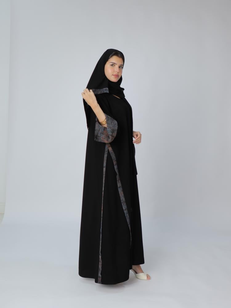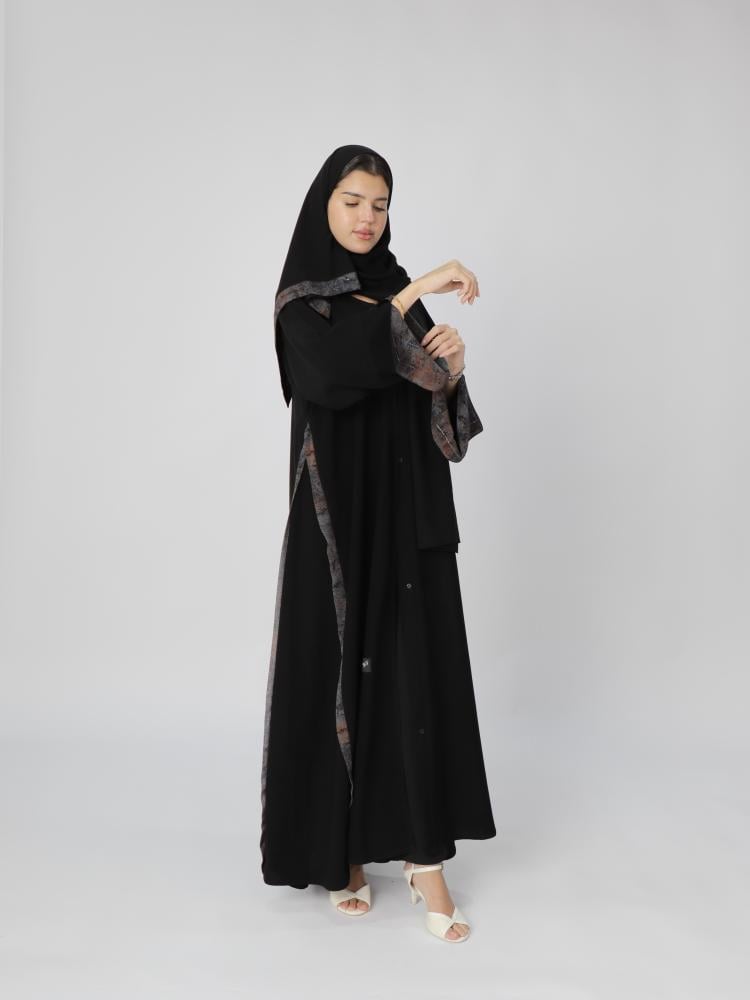 عباية نص كلوش قماش ملكي مع تدخيلات شيفون لامع